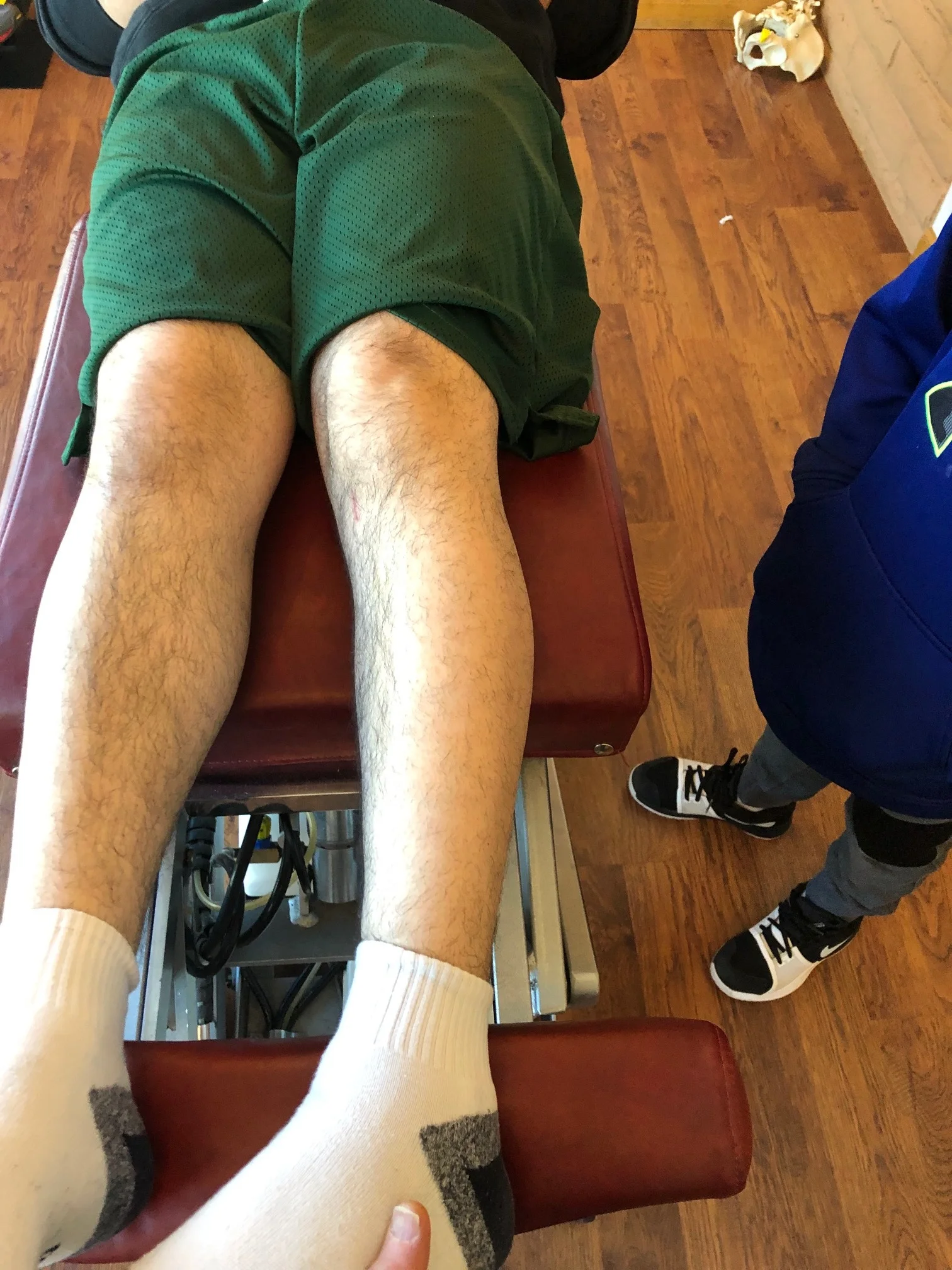 His exam found him to have a right sided anatomical leg length discrepancy, tibial left (see above) and femoral retro torsion on the right with no internal rotation of the hip past 0 degrees (see picture of full internal rotation of the right hip and cmpare it with the left); left side had approximately 10 degrees internal rotation. He also has bilateral internal tibial torsion, R > L. Palpation findings revealed tightness in the lumbar multifidus and quadratus lumborum with a loss of lateral bending to the right at L2 through L4 and a loss of flexion about the right sacroiliac joint. Lower extremity reflexes were 2+ with bilateral symmetry; sensation to vibration was intact at the distal phalanges; motor strength was strong and graded as 5/5.