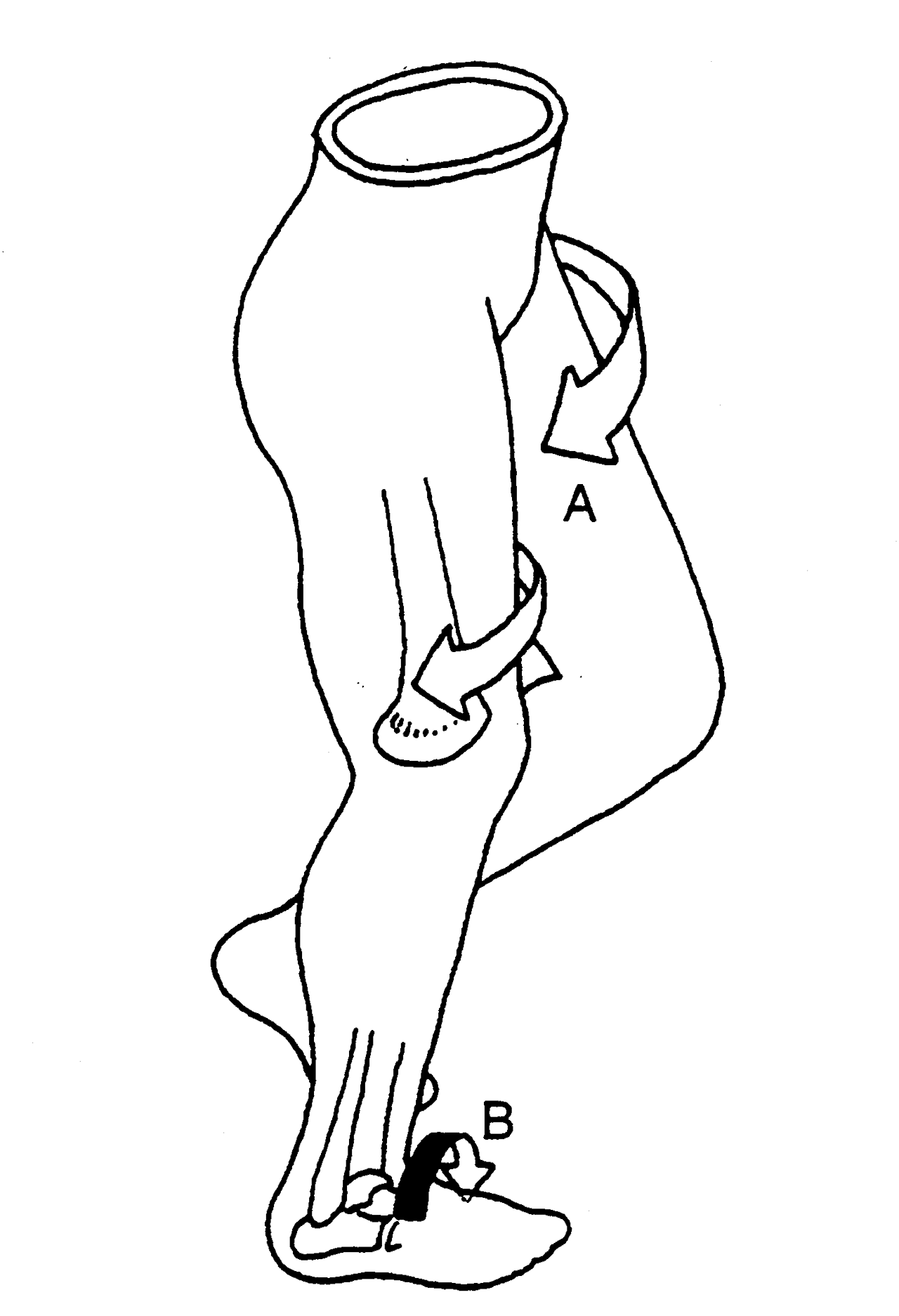 It is necessary for the thigh and leg to externally rotate while the pelvis is rotating counter clockwise, because of the constraints of the iliofemoral, pubeofemoral and ishiofemoal ligaments.