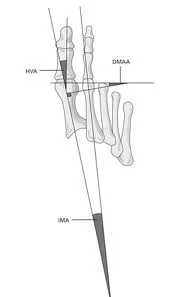 One other measurement is the Distal Metatarsal Articular Angle, which measures the angle between the metatarsal shaft and the base of the distal articular cap (ie, where the cartilage is) of the 1st metatarsal. This typically should be less than 10 degrees, preferably less than 6 degrees. Remember, these are static angles, things can change with movement, engagement, weight bearing strategies and shoes. What you see statically does not always predict dynamic angles and joint relationship.s