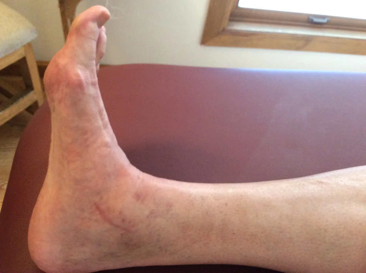 She recently underwent surgery for a broken fibula (distal with plate fixation) and microfracrure of the medial malleolus. You are looking at her full range of dorsiflexion which is improved from approximately 20° plantarflexion. She is now at just under 5°.